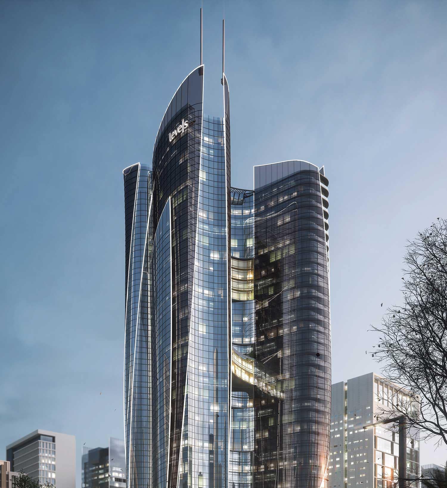 يدمج تصميم البرج بين عناصر تجريدية طبيعية في قلب المبنى حيث يتم تقسيم المبنى إلى طوابق ذات أسماء وطابع مختلف. بدءاً من ليفلز مول، التصميم الداخلي للنسخة البيضاء للمنطقة التجارية. تليها سيلين، النسخة الرمادية من الداخل لمساحات المكاتب. ثم يأتي Sol بتصميم داخلي باللون الأسود للمساحات الإدارية. أخيرًا وليس آخرًا، Arura ، التصميم الداخلي الملون لردهة السماء والمكاتب الإدارية والشقق الفندقية.